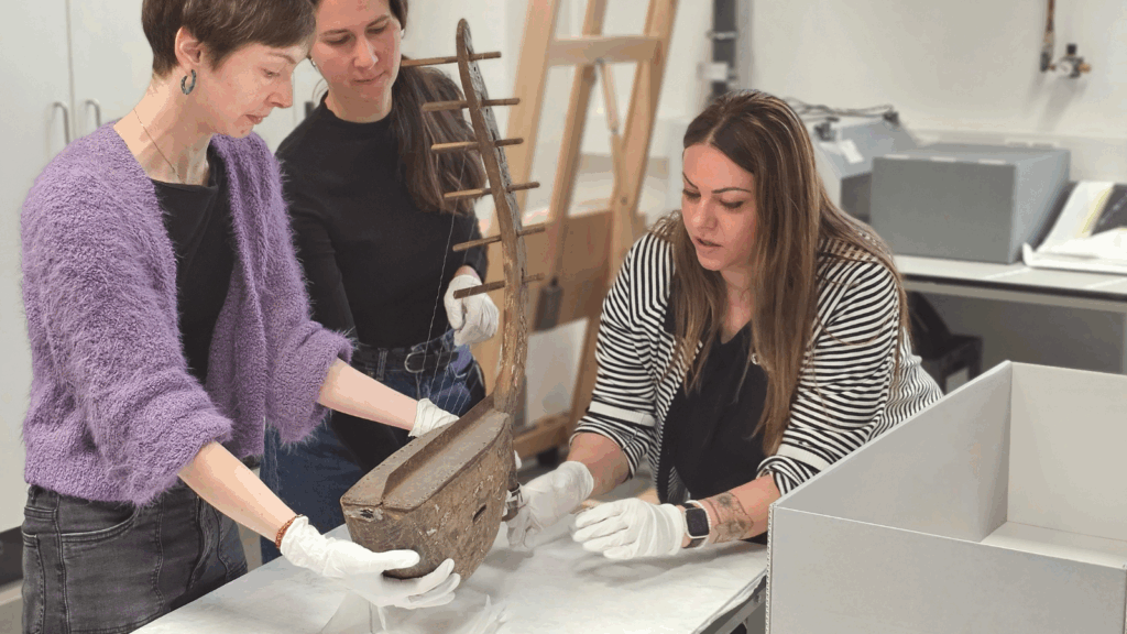 Dienstagmorgen in der Restaurierungswerkstatt im Forum Wissen. Ein gut beleuchteter klimatisierter Raum im Keller des Forum Wissen. Die Restauratorin Lisa Hackel begrüßt uns Teilnehmende zum Objekt-Handling-Workshop. Wir arbeiten alle beim Forum Wissen, kommen aber aus ganz unterschiedlichen Bereichen, die nicht