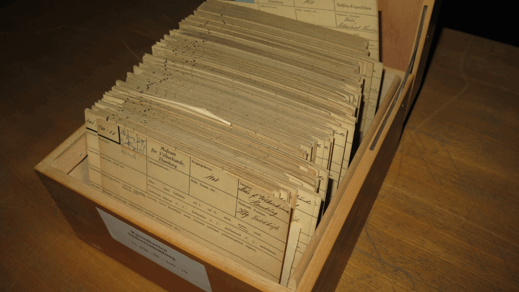Karteikasten mit Daten zu Human Remains aus kolonialen Kontexten