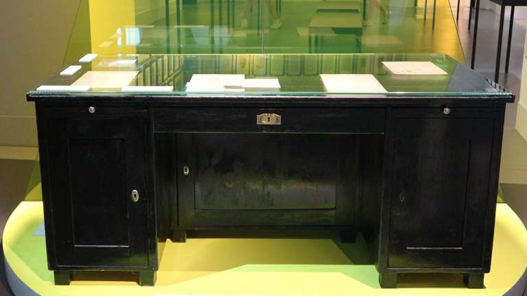 Das Möbelstück ist Teil der Inszenierung des Raumes „Schreibtisch“, in dem es um die Schreibprozesse beim wissenschaftlichen Arbeiten geht: um das Abschreiben, Analysieren Zusammenfassen, aber auch um das verzweifelte Gefühl, wenn man vor dem noch weißen Blatt sitzt und nicht weiß, wie anzufangen. Und um das Schreiben, Verwerfen, erneute Ansetzen.