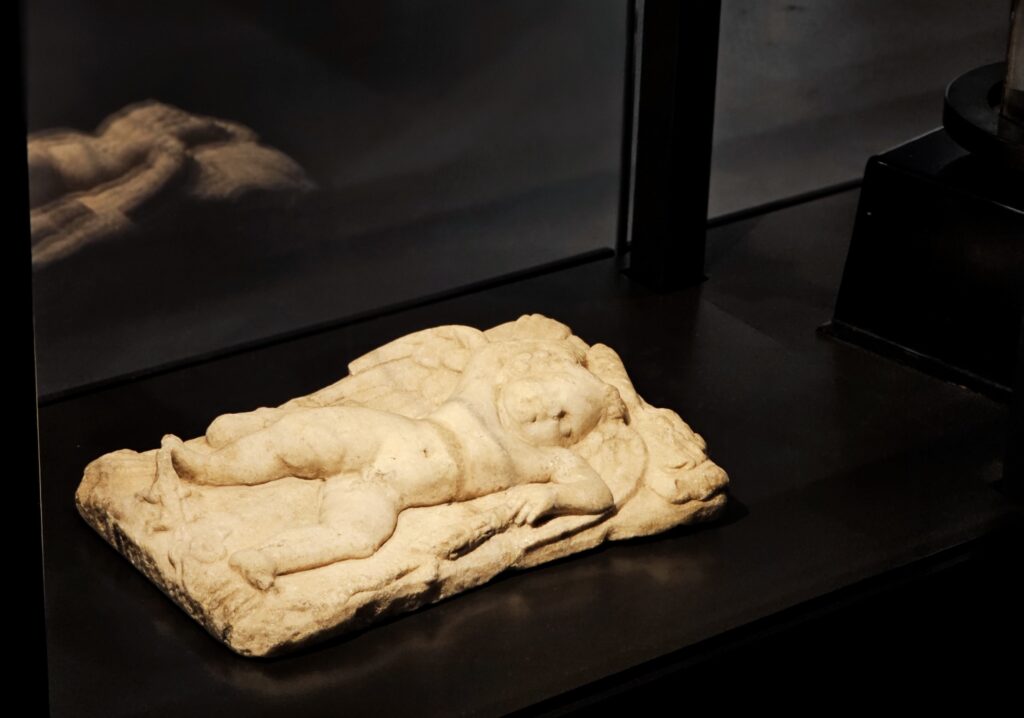 Im Sammlungsschaufenster des Forum Wissen bekommen Besucher*innen eine Kostprobe der vielfältigen Stücke aus der Sammlung antiker Originale des Göttinger Archäologischen Institut. Auf einem Glockenkrater strecken zwei Liebende die Hände nacheinander aus, während den Besucher*innen das Gesicht einer ägyptischen Mumie entgegenblickt. Neben diesen Stücken liegt schlafend ein kleiner Eros aus Mamor.