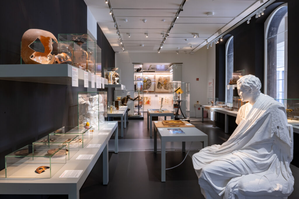 Ein Großteil der Sammlung besteht aus typischen, weit verbreiteten Objekten, die für das Studium und die Lehre ausgewählt wurden. Anstelle von Seltenheiten finden sich hier häufige Fundstücke, die den Student*innen als Anschauungsmaterial dienen. Diese können so zum Beispiel lernen mit den unzähligen Scherben verschiedener Gefäße zu arbeiten. Einige davon sind auch im Sammlungsschaufenster und im Raum “Werkstatt” im Forum Wissen zu sehen. Diese Objekte unterstützen nicht nur den Erwerb archäologischer und museologischer Fähigkeiten, sondern bieten auch dem interessierten Publikum einen lebendigen Einblick in die materielle Kultur der Antike. Darunter sind auch einige wissenschaftlich bedeutende Originale, wie etwa einige berühmte Bronzestatuetten etruskischer Priester, die gelegentlich auch für internationalen Ausstellungen ausgeliehen werden.