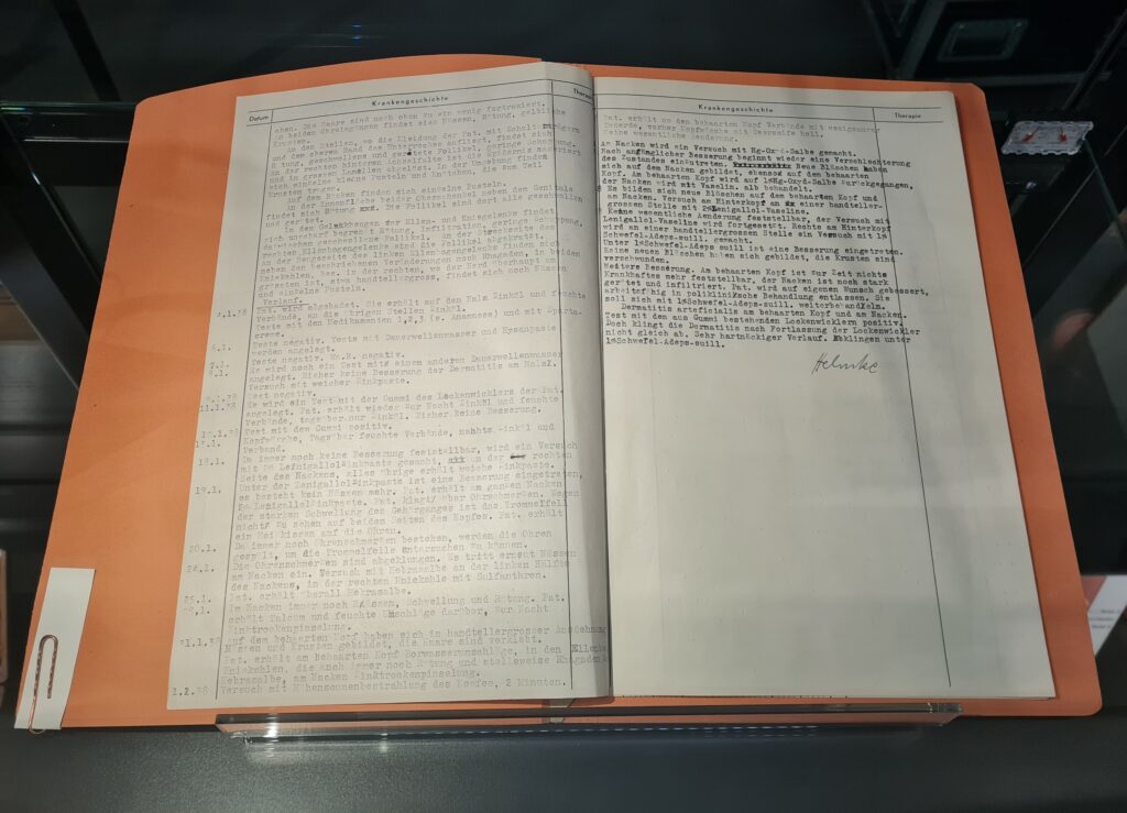 Ein interessantes Objekt ist die Krankenakte einer Patientin mit Dermatitis artificialis aus dem Jahr 1938. Vorgeschichte, Diagnose und Verlauf einer Hautkrankheit werden in dieser Akte beschrieben. Es stellte sich heraus, dass die Entzündung der Patientin durch Gummi ausgelöst wurde. Die Behandlung mit verschiedenen Salben war zunächst erfolglos. Der dokumentierte Briefwechsel zwischen Arzt und Patientin zeigt jedoch, wie intensiv die Bemühungen waren, die Krankheit zu behandeln und ein Ausbreiten zu verhindern.