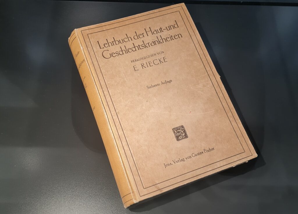 Im Sammlungsschaufenster des Forum Wissen sind verschiedene Objekte ausgestellt, die Einblicke in die Geschichte der Medizin und die Behandlung von Haut- und Geschlechtskrankheiten ermöglichen. Ein Apothekengefäß für Salbe aus der Göttinger Klinik und Poliklinik für Haut- und Geschlechtskrankheiten stammt etwa aus der Zeit zwischen 1960 und 1980. Dieses Gefäß steht für die Vielfalt der in der Vergangenheit angewandten Methoden, um Patienten mit Krätze, Gonorrhö oder Syphilis zu behandeln. Damals spielten Salben, Zinkpasten, Jod oder Quecksilber eine bedeutende Rolle bei der Linderung von Beschwerden.