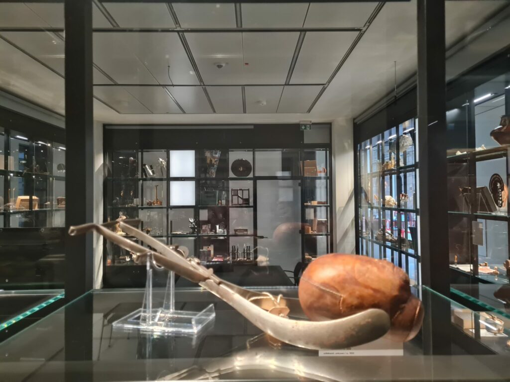 Die Sammlung Im Sammlungsschaufenster des Forum Wissen ist die ägyptische Göttin Isis zu finden, wie sie kniend ihren Sohn Horus im Arm hält. Ihre Brust ist unbedeckt und ihre Arme sind mit Bemalungen verziert. Aus ihrem schwarzen Haar ragen ein