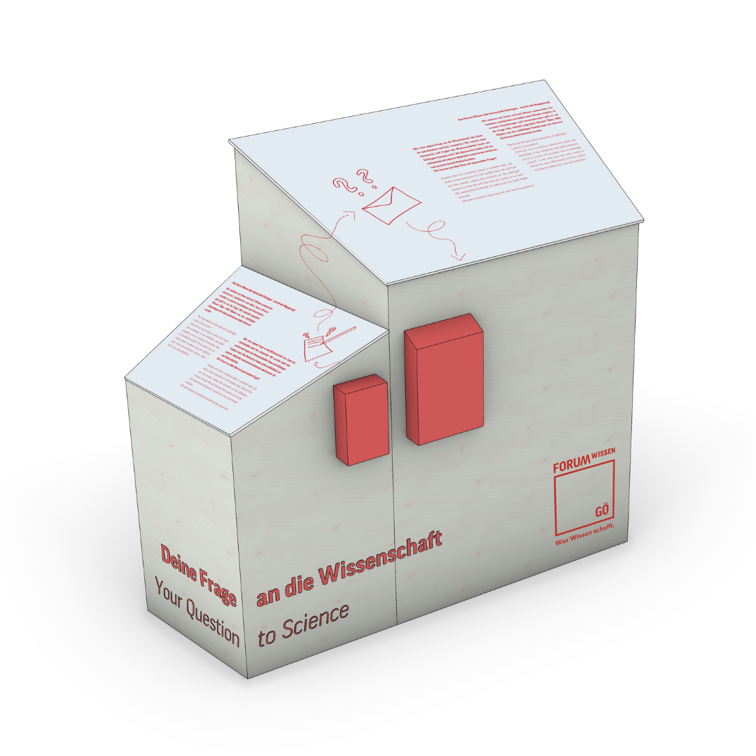 Eine Briefkastenstation auf unserem Vorplatz lädt unserer Besucher*innen ein, ihre Frage an ‚die Wissenschaft‘ zu stellen. Eine Auswahl dieser Fragen wird vom Forum Wissen-Team an Wissenschaftler*innen der Universität Göttingen weitergeleitet. Fragen und Antworten werden auf unseren digitalen Kanälen veröffentlicht.