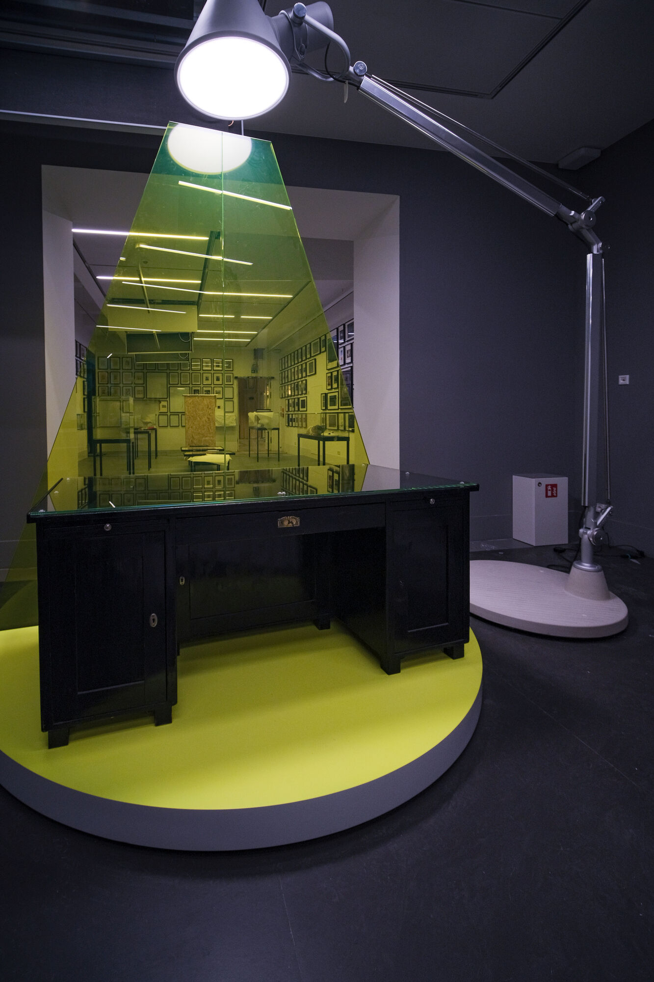 At the desk, ideas are put down on paper, they are organised and prepared for publication. A huge walk-in desk invites you to explore different writing practices.