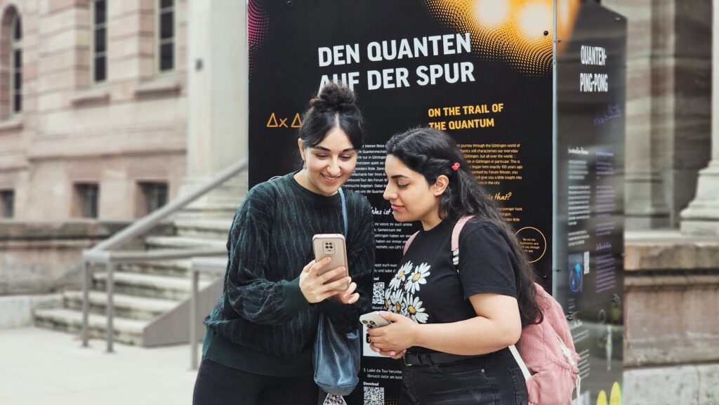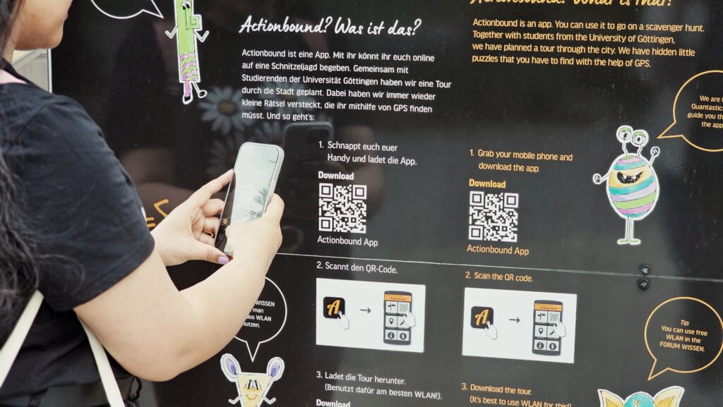 Zur Sonderausstellung „Was zum Quant?!“ haben Physik-Studierende der Universität Göttingen gemeinsam mit unserem Team eine interaktive Stadt-Rallye entwickelt – spannend, spielerisch und kostenlos. Mithilfe der kostenfreien App Actionbound geht es auf digitale Entdeckungstour durch Göttingen. Ziel sind sechs Stationen, die in der Stadt verteilt sind – mit Fokus auf dem Thema Quantenphysik. Rätsel und verschiedene Aufgaben machen die Tour abwechslungsreich und verständlich – auch ohne Vorwissen. Drei Stationen sind mit Infostelen ausgestattet. Eine Stele steht vor dem Forum Wissen! Dort ist auch der Start- und Zielpunkt. Im Forum Wissen kann man das WLAN zum Runterladen der App und der Tourdaten nutzen. Weitere Informationen und Flyer gibt es am Infotresen im Forum Wissen.